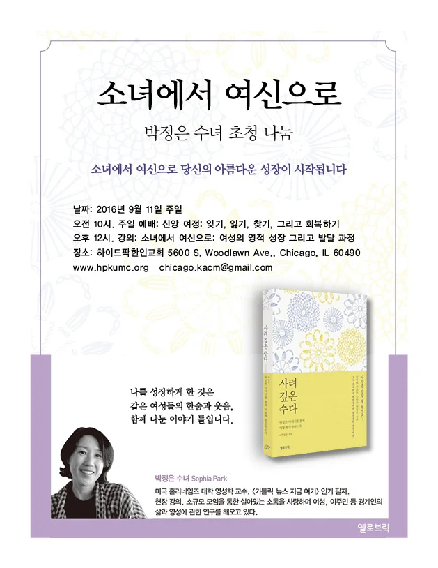 (3) 주일예배(오전 10시): “신앙 여정: 잊기, 잃기, 찾기, 그리고 회복하기” 강의(오후 12시) : “소녀에서 여신으로: 여성의 영적 성장 그리고 발달과정”