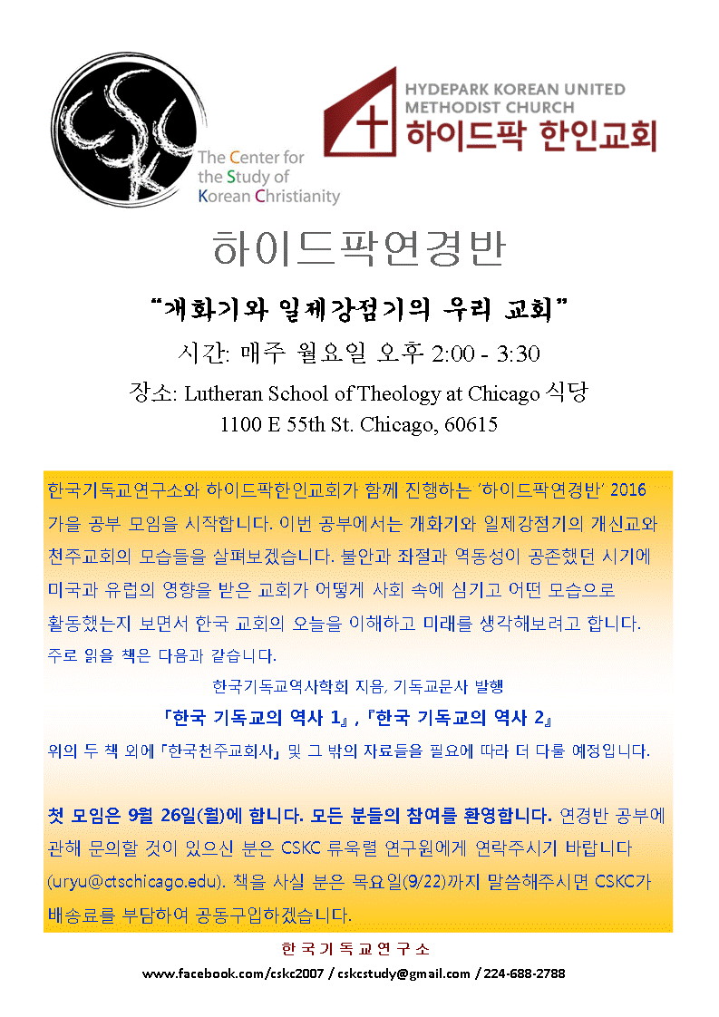 우리 교회와 시카고 한국기독교연구소(CSKC)가 함께 진행하는 ‘하이드팍연경반’ 2016 가을 공부 모임을 시작합니다.